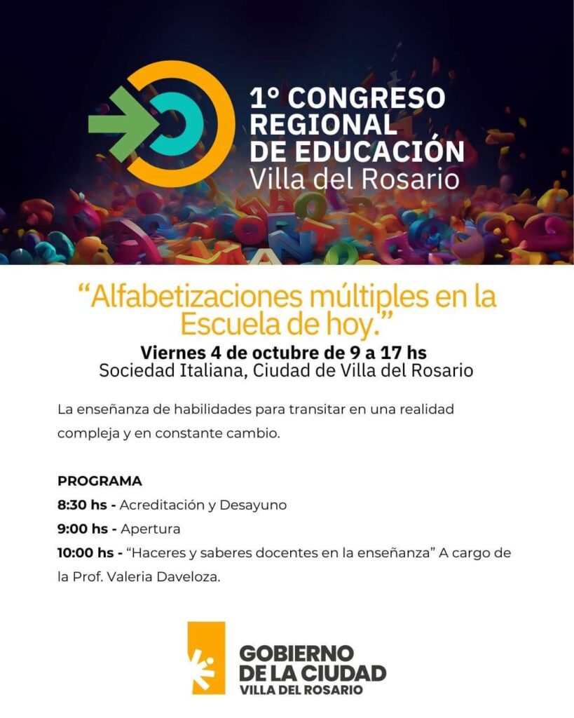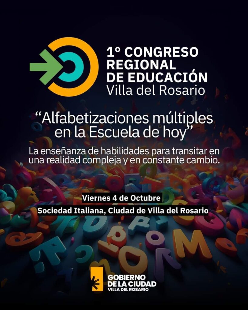 Se viene el 1°Congreso Regional de Educación en Villa del Rosario “Alfabetizaciones múltiples en la Escuela de hoy”, la enseñanza de habilidades para transitar en una realidad compleja y en constante cambio. El mismo se llevará a cabo el viernes 4 de Octubre en la Sociedad Italiana.