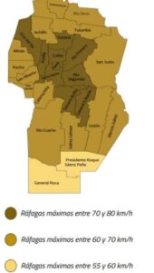 Se prevé el ingreso de un frente frío entre la siesta/tarde del martes esto permitiría el desarrollo de ráfagas importantes del sector sur en diversos sectores de la provincia incluido el departamento Río Segundo. Las intensidades máximas previstas serían entre 70 y 80 km/h, asociado a estas ráfagas se podrían generar disminuciones importantes de visibilidad por polvo levantado por el viento.