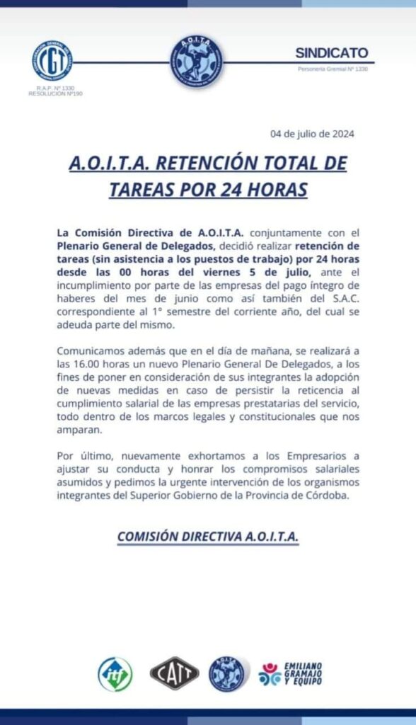 SociedadAOITA DECLARO PARO DE COLECTIVOS INTERURBANOS EN CÓRDOBA Info Regional1 año atrás1 año atrás01 minutos Mediante un comunicado A.O.I.T.A declaró la retención de tareas para este viernes 5 de julio durante 24 hs, debido al reclamo por el pago integro de los haberes de junio y el aguinaldo. Navegación de entradas Anterior: PILAR – AGENDA DE TALLERES DEPORTIVOS GRATUITOSSiguiente: PARO DE AOITA- QUE EMPRESAS SI CIRCULAN HOY Deja una respuesta Cancelar la respuestaTu dirección de correo electrónico no será publicada. Los campos obligatorios están marcados con *Comentario * Nombre * Correo electrónico * Web