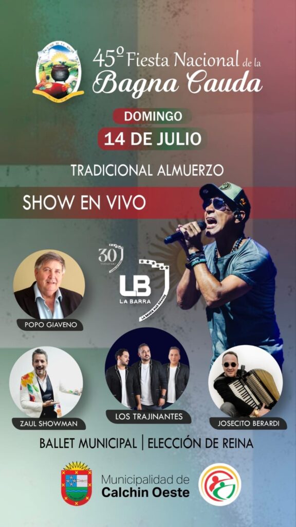 En la localidad de Calchín Oeste, el domingo 14 de julio de 2024 se festeja la 45° edición de la Fiesta Nacional de la Bagna Cauda en el salón Guillermo Brown.