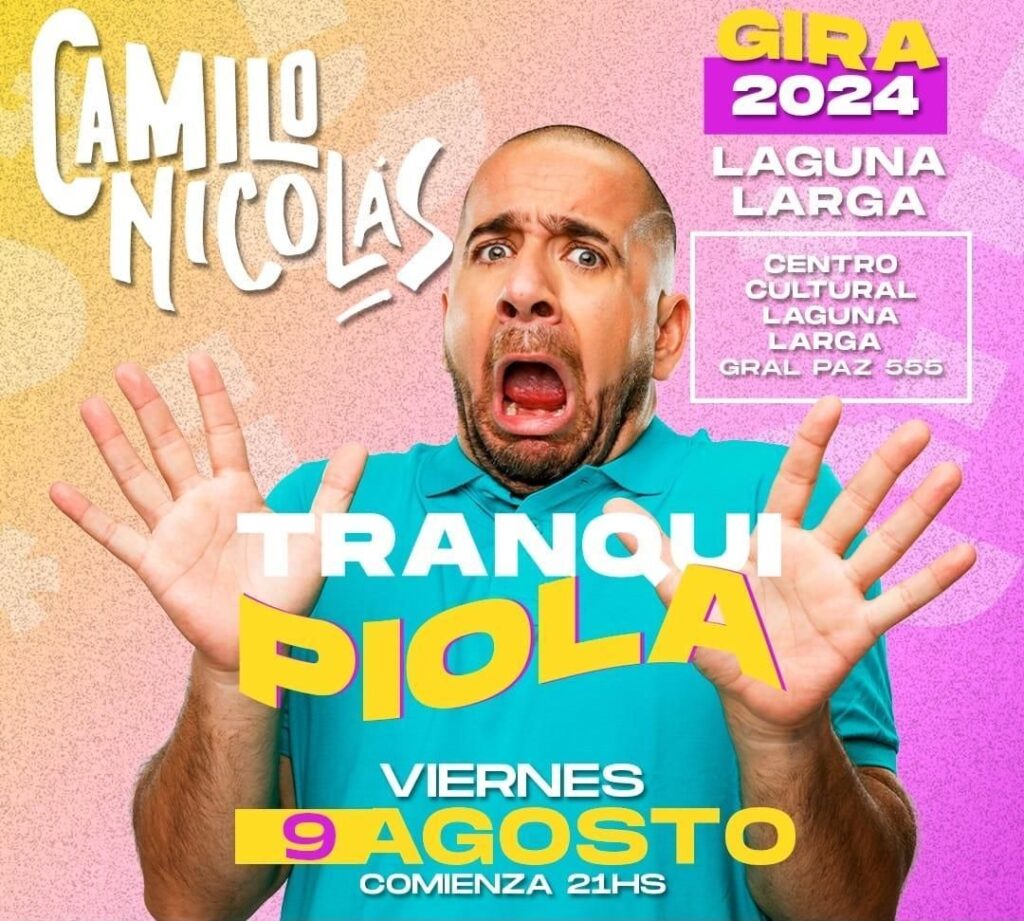 Llega el humor de Camilo Nicolás a Laguna Larga, será el próximo 9 de Agosto con su show «Tranqui Piola gira 2024» al Centro Cultural Victoriano Puglié, última vez para ésta zona ya que su despedida de esta gira será el 21 de Septiembre en la ciudad de las artes de Córdoba Capital.