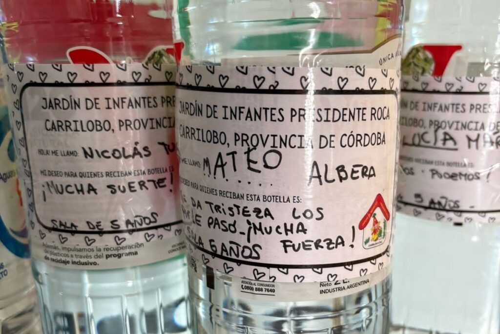 Pero esta historia no solo se trata de donativos materiales. En las botellas de agua mineral enviadas, los niños del Jardín de Infantes Presidente Rocca pegaron mensajes escritos con sus propias manos, llenos de palabras de aliento, amor y esperanza. Cada botella llevó consigo no solo agua, sino también un mensaje conmovedor que cruzó kilómetros, tocando los corazones de aquellos que enfrentan este difícil momento.
