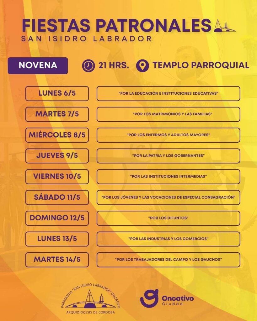 El pasado lunes dio inicio la novena patronal en el Templo Parroquial de Oncativo. La ciudad tiene como Santo Patrono a San Isidro Labrador. Cada noche, se propone la oración especial por distintas intenciones.