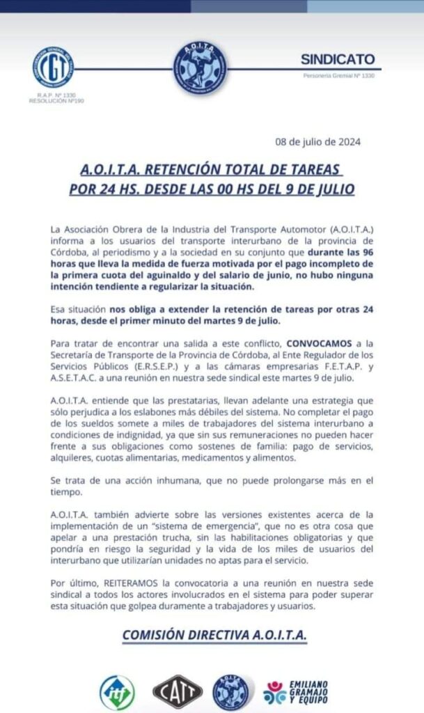 SociedadCONTINUA POR 24 HS MÁS EL PARO DE INTERURBANOS EN CÓRDOBA Info Regional1 año atrás01 minutos A través de un comunicado A.O.I.T.A confirmo la continuidad del paro por 24 hs más, extendiéndose por toda la jornada del martes 9 de julio. Navegación de entradas Anterior: CALCHIN OESTE – SE VIENE LA 45° EDICIÓN DE LA FIESTA DE LA BAGNA CAUDA EL DOMINGO 14 DE JULIOSiguiente: ACCIDENTE EN LA ZONA RURAL DE ONCATIVO Deja una respuesta Cancelar la respuestaTu dirección de correo electrónico no será publicada. Los campos obligatorios están marcados con *Comentario * Nombre * Correo electrónico * Web