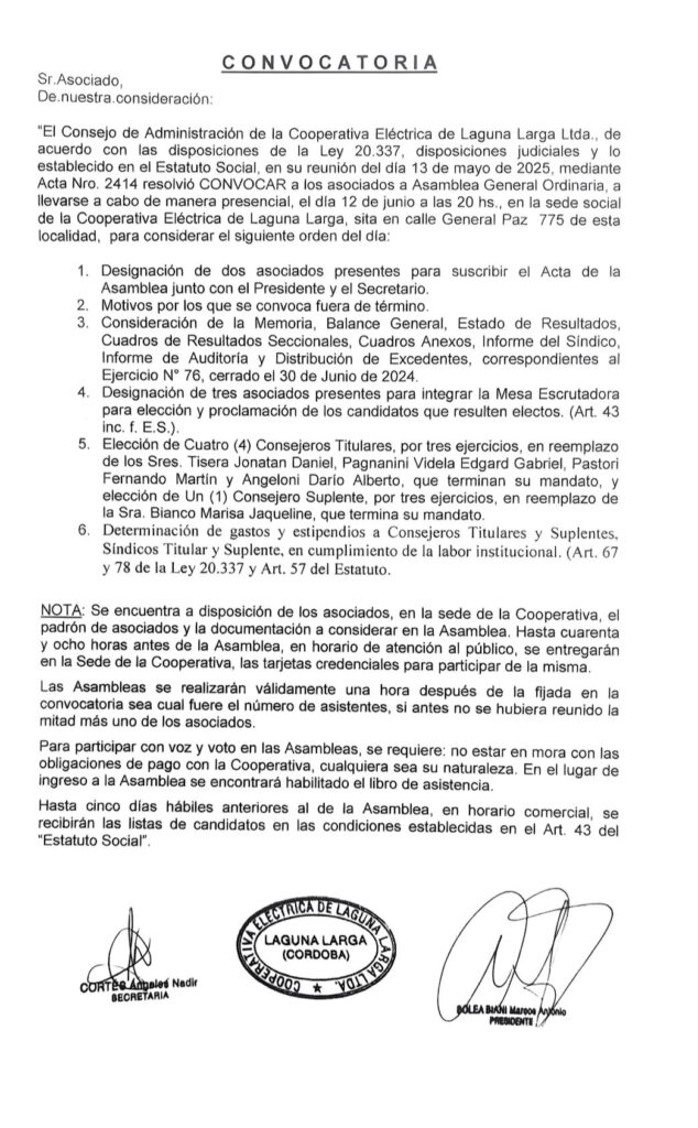 La comunidad de Laguna Larga se encuentra en medio de un intenso debate tras conocerse la convocatoria a la Asamblea General Ordinaria de la Cooperativa Eléctrica de Laguna Larga Ltda., prevista para el 12 de junio de 2025. En la reunión se tratarán diversos temas administrativos y financieros, pero el punto que ha generado mayor controversia es el artículo 6 del orden del día, que plantea la posibilidad de otorgar un pago mensual a los consejeros titulares y suplentes, así como a los síndicos.