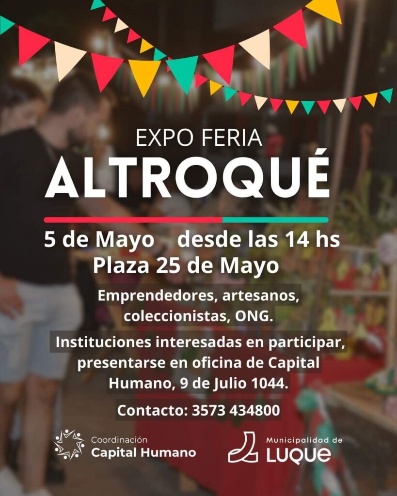 Domingo 5 de Mayo desde las 14 hs en plaza 25 de Mayo se llevara a cabo la Expo Feria Altroqué, que reune a emprendedores, artesanos, coleccionistas, ONG. Las instituciones interesadas en participar, pueden presentarse en oficina de Capital Humano de la Municipalidad de Luque en 9 de Julio 1044 o contactarse al 3573-434800