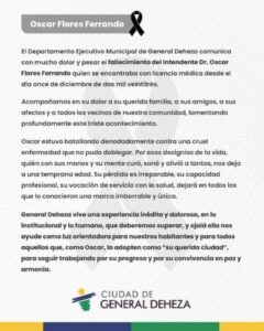 La Municipalidad de General Deheza informó que falleció hoy el intendente Oscar Flores Ferrando, quien atravesaba una dura enfermedad y se encontraba de licencia médica desde diciembre.