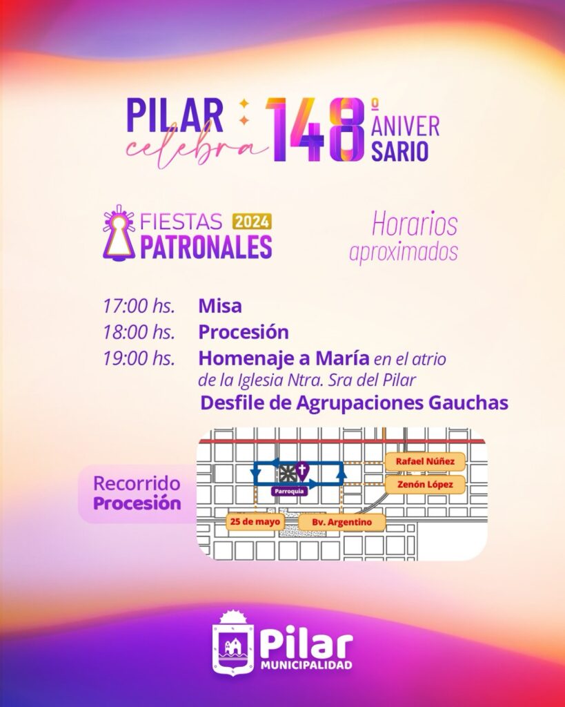 El sábado 12 de octubre, desde las 18 hs, se llevará a cabo la Procesión acompañando a la Santísima Virgen del Pilar, patrona de la ciudad.