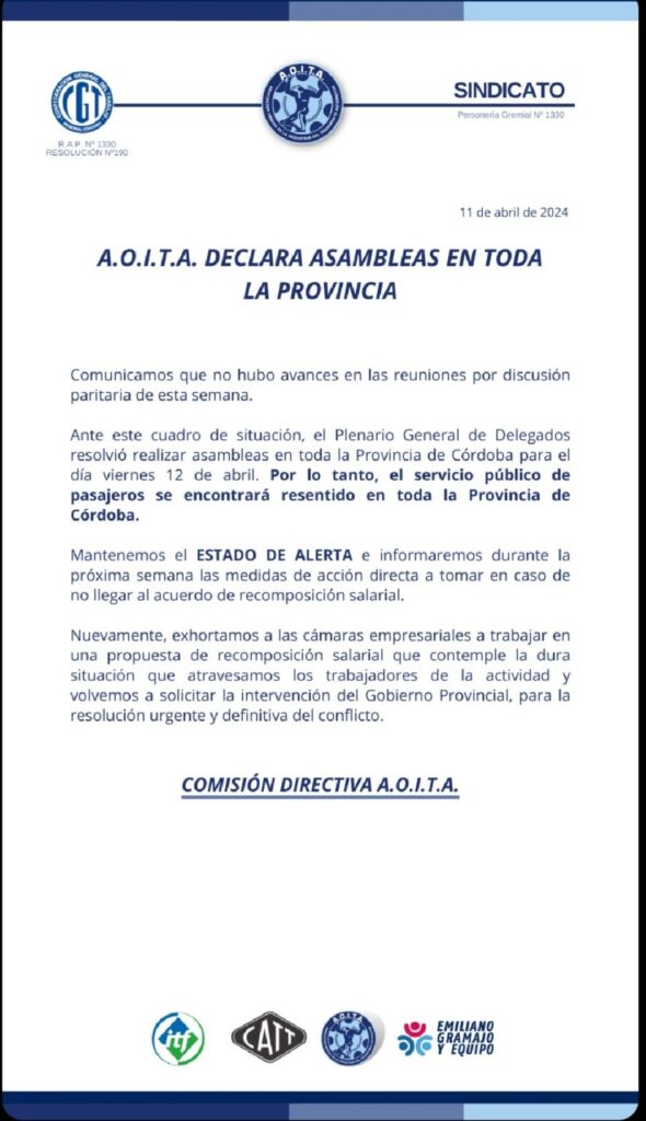 Desde Aoita advirtieron que las asambleas eran informativas y no determinaron un horario específico, por lo que el servicio se encontraba resentido en toda la provincia. A las 8, desde Aoita informaron que las reuniones finalizaron y que “los servicios se irán normalizando mientras salen de las puntas de líneas o empresas”.