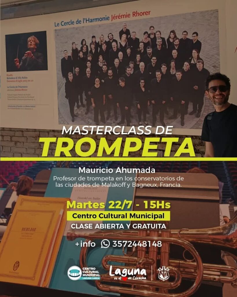 Este martes 22 de julio a las 15:00 horas, el Centro Cultural Municipal de Laguna Larga será escenario de una actividad cultural de alto nivel: una Masterclass de Trompeta dictada por el reconocido músico y docente Mauricio Ahumada, quien actualmente se desempeña como profesor en conservatorios de la ciudad de Francia.