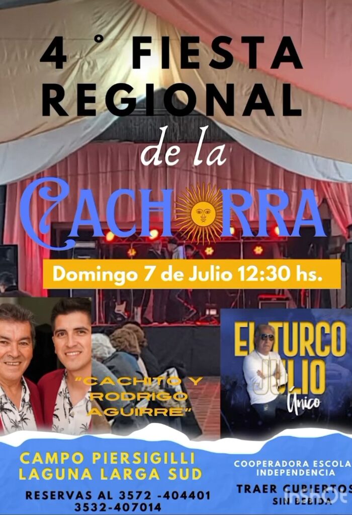 Llega la 4° Fiesta Regional de la Cachorra en Campo Piersigilli Laguna Larga, organizado por la Cooperadora Escolar Independencia, se llevará a cabo el próximo Domingo 7 de Julio desde las 12:30 hs, contará con la actuación de Cachito y Rodrigo Aguirre, y El Turco Julio.