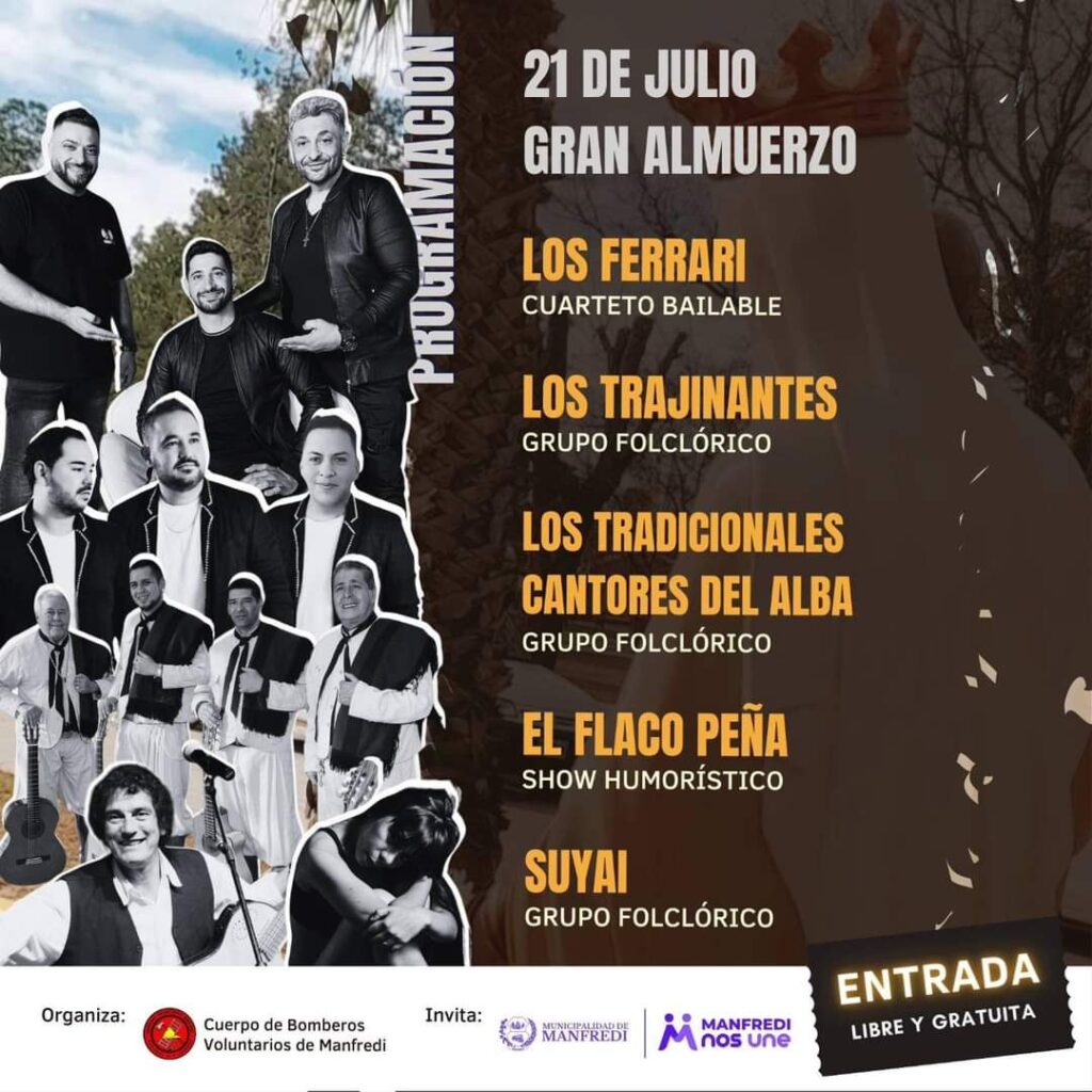 Al mediodía se llevara a cabo un almuerzo organizado por Cuerpo de Bomberos Voluntarios de Manfredi en el Salón del Centenario con una espectacular grilla folclórica y de cuarteto bailable.