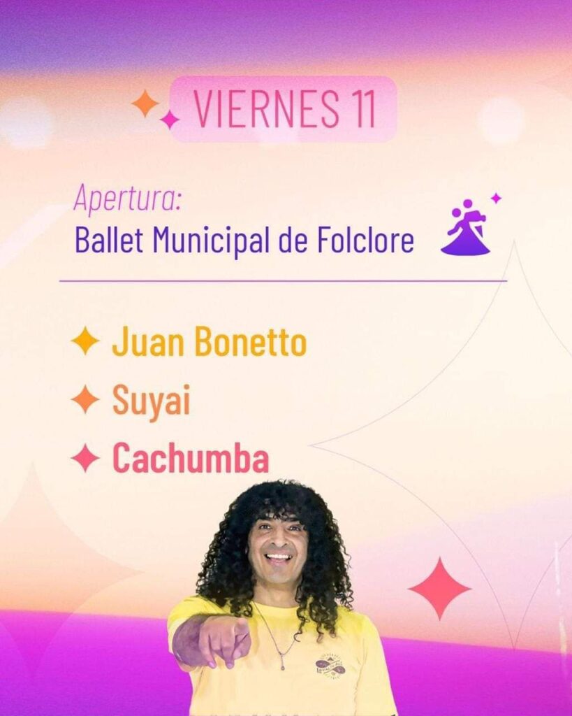 Ya está confirmada la grilla de artistas para cada jornada. El viernes 11, la apertura estará a cargo del Ballet Municipal de Folklore y se contará con las presentaciones de Juan Bonetto, Suyai y Cachumba.