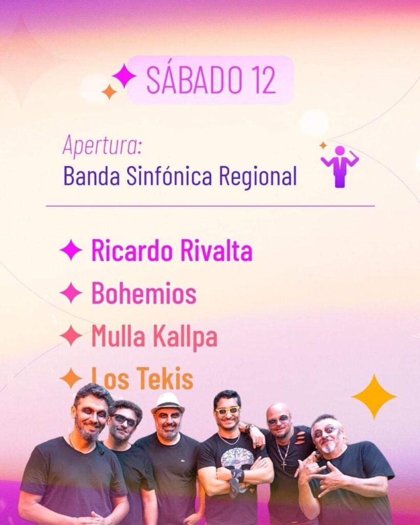 En tanto que el sábado 12, comenzará con la Banda Sinfónica Regional y luego será el turno de Ricardo Rivalta, Bohemios, Mulla Kalpa y gran cierre a cargo de Los Tekis.