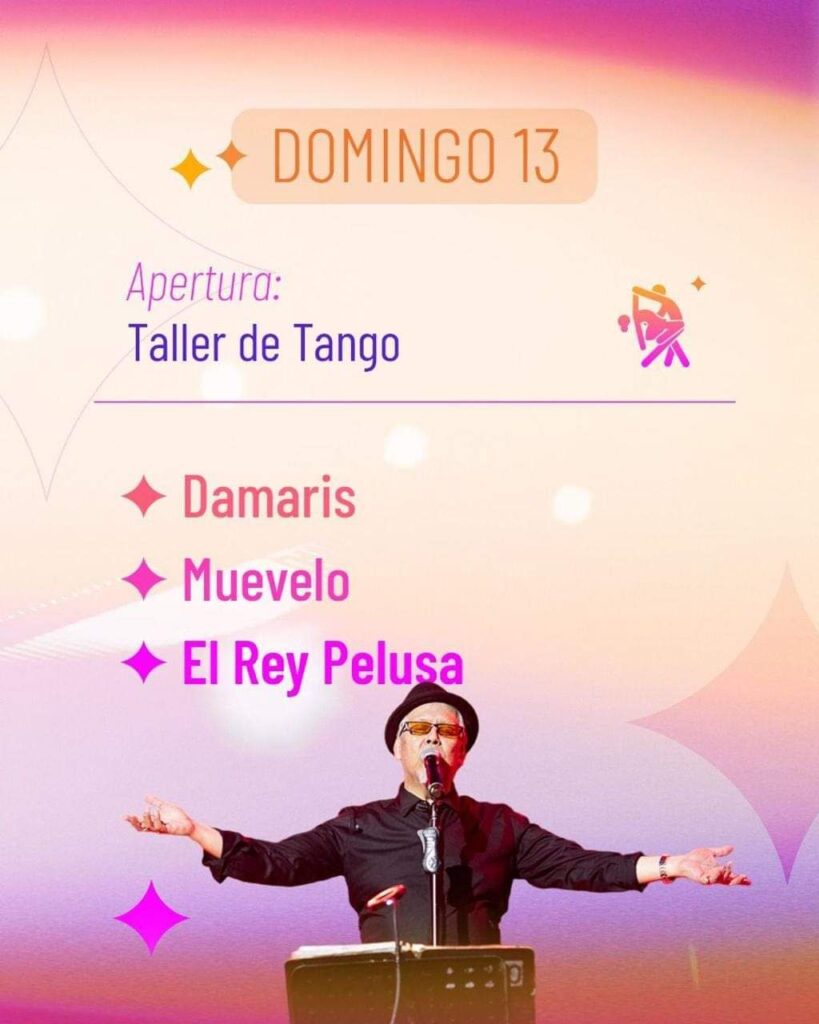 El domingo 13 iniciará con el taller de tango para posteriormente bailar al ritmo de Damaris, Muévelo y el Rey Pelusa.