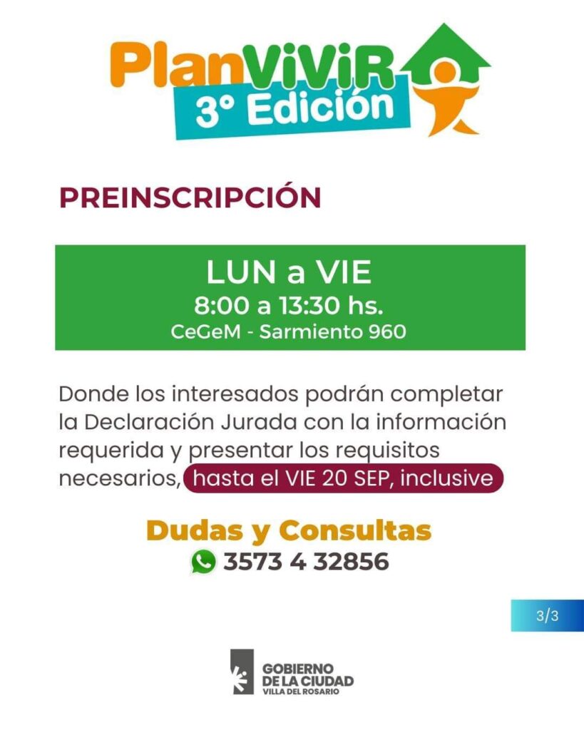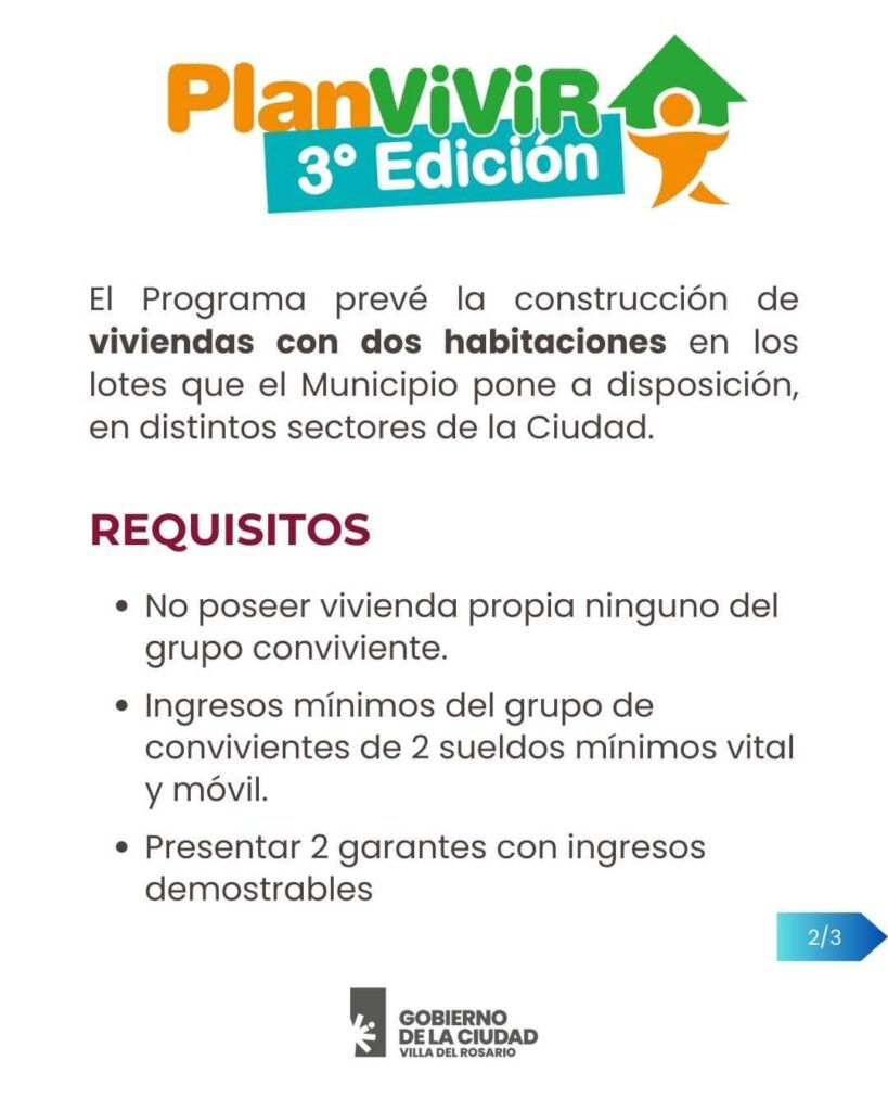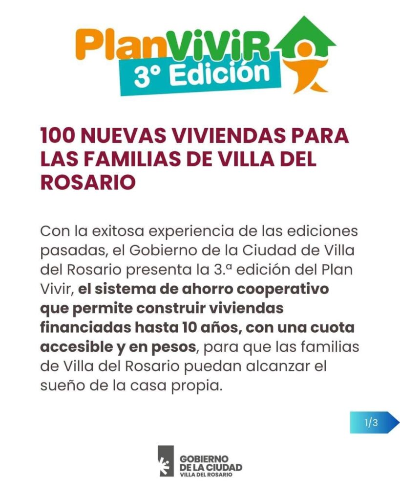 Con la exitosa experiencia de las ediciones pasadas, el Municipio lanza la prescripció del Plan Vivir 3, el sistema de ahorro cooperativo que permite construir viviendas financiadas hasta 10 años, con una cuota accesible y en pesos, para que las familias de Villa del Rosario puedan alcanzar el sueño de la casa propia.