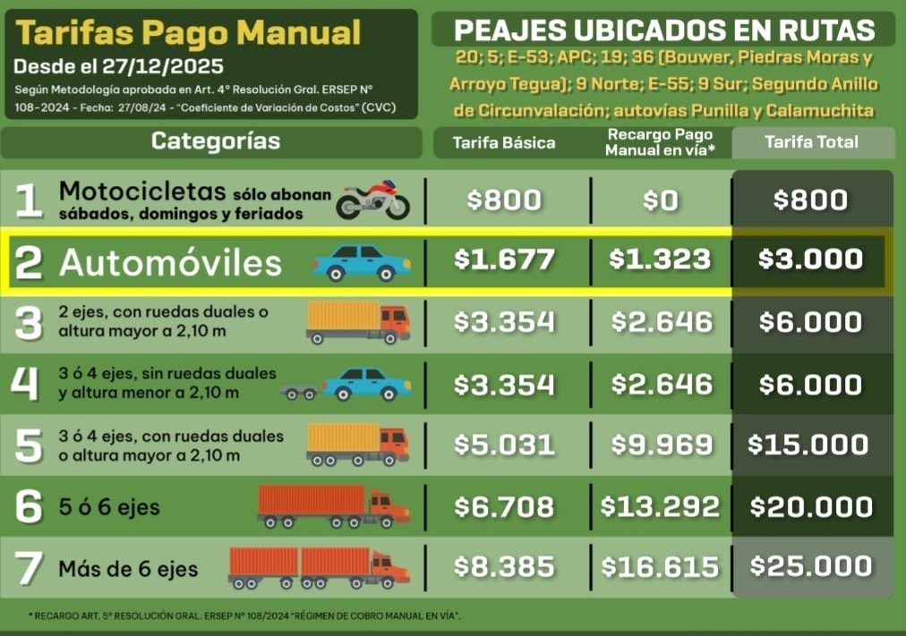 Con la aplicación del nuevo cuadro tarifario en la Red de Accesos a Córdoba (RAC), el pago manual en efectivo pasará a ser la alternativa más onerosa para los automovilistas. A partir de las 0 horas del sábado 27 de diciembre, quienes opten por esta modalidad deberán abonar $3.000 por pasada, lo que representa un incremento significativo respecto de la tarifa anterior, que era de $2.000.