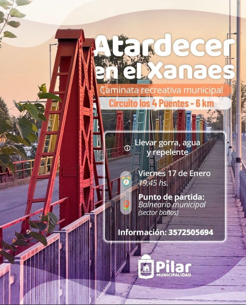 Este viernes 17 de enero a las 19:45 horas, la Municipalidad de Pilar te invita a sumarte a la primera caminata recreativa del año. La actividad se realizará en el Circuito de los Cuatro Puentes, que incluye el Puente Negro, Gamaggio, el Puente Carretero RN N9 y el histórico Puente Naranja.