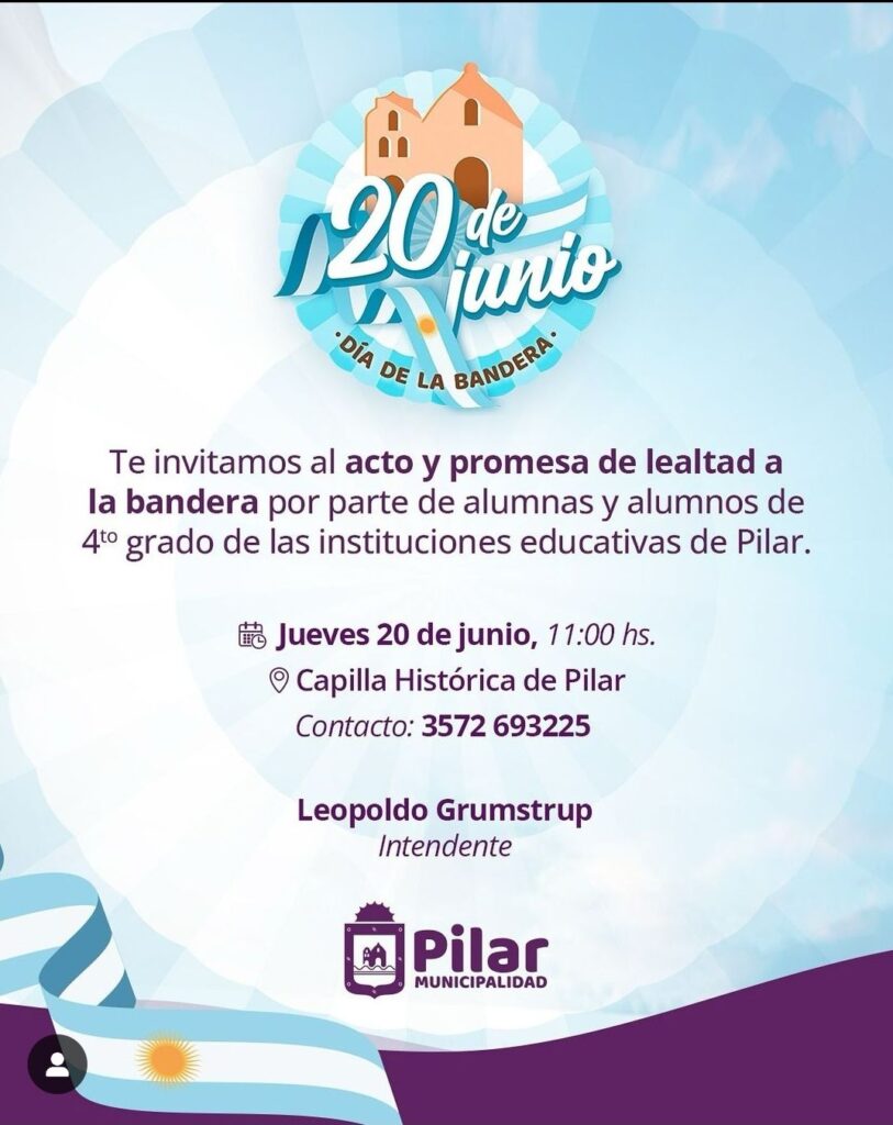 El acto se llevara a cabo el 20 de Junio a las 11:00 hs en la Capilla Histórica de Pilar, donde tomarán promesa a la bandera a alumnas y alumnos de 4to grado de las instituciones educativas de la localidad.