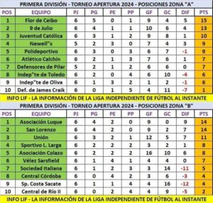 DeportesPOSICIONES PRIMERA DIVISIÓN TORNEO APERTURA 2024 LIF Info Regional2 años atrás2 años atrás01 mins Así están las posiciones del campeonato hasta el momento. Con un partido entre Newell’s y Defensores de Pilar que está pendiente. Fuente: Info LIF Navegación de entradas Anterior: IMPACTARON DE FRENTE 2 VEHICULOS EN PILARSiguiente: INTERURBANOS: OTRA SEMANA DE INCERTIDUMBRE EN EL SERVICIO Deja una respuesta Cancelar la respuestaTu dirección de correo electrónico no será publicada. Los campos obligatorios están marcados con *Comentario * Nombre * Correo electrónico * Web