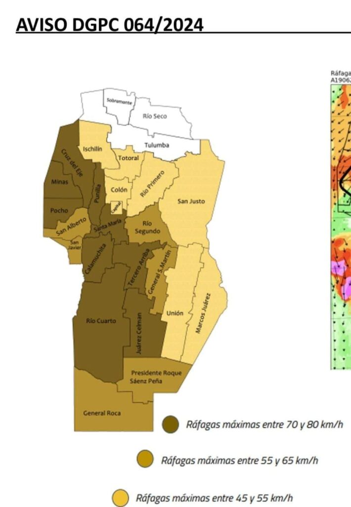 También se registraría viento moderado a regulares con rafagas temporarias entre 45 y 55km/h en sectores del centro, este, norte y sudeste provincial. En el mapa politico se destacan en marrón oscuro, los departamentos que serían más afectados por las ráfagas mencionadas previamente. La intensidad del viento iría disminuyendo gradualmente en horas de la tarde del lunes.