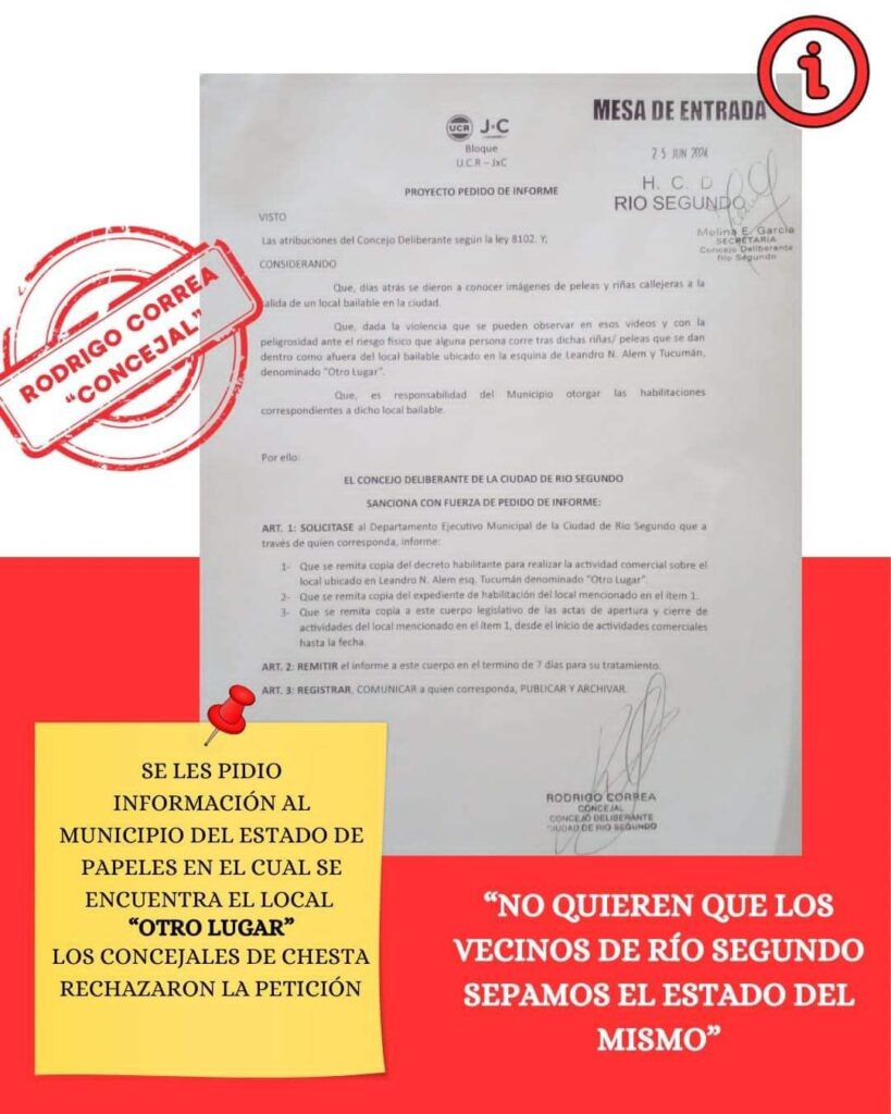 Además, insistió en que el lugar “no puede estar habilitado” como boliche porque “tiene paredes de tarima y techo de chapa”. “Eso me motivó a presentar el pedido de informe”, aclaró el concejal opositor en la localidad de Río Segundo.