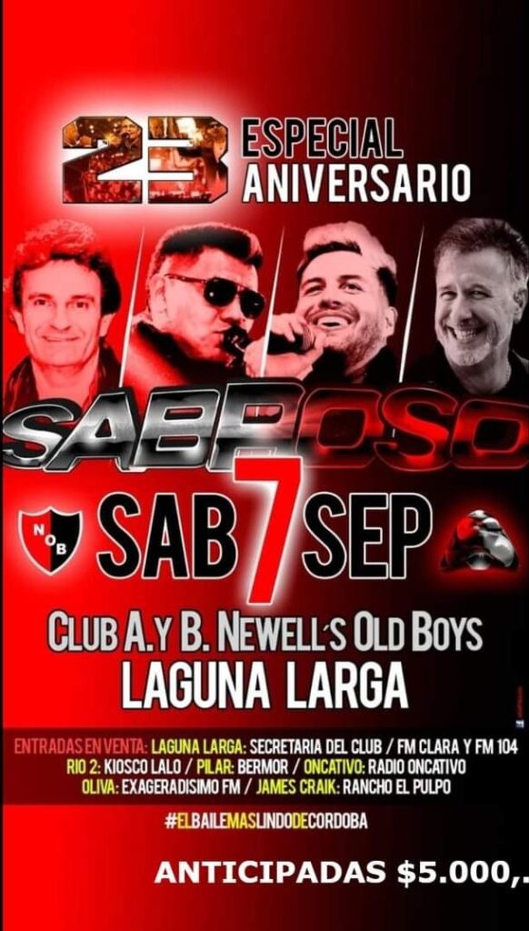 Este Sábado 7 de Septiembre el Club Newell´s Old Boys de Laguna Larga se llena de fiesta, llega Sabroso presentando todos sus éxitos, podes conseguir tu anticipada en tu radio amiga.