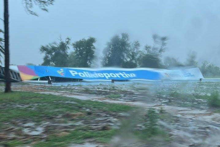 Una violenta tormenta con ráfagas de viento y lluvia intensa provocó esta mañana el derrumbe parcial del Polideportivo Social que la Provincia construía en Miramar de Ansenuza.