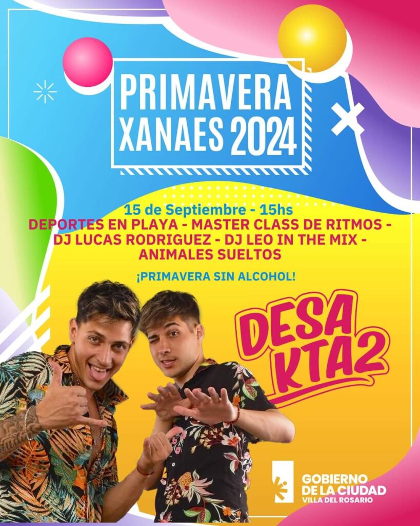 El domingo 15 de septiembre se viene un festejo de la primavera espectacular, organizado por la Municipalidad de Villa del Rosario, desde las 15:00 hs con la Feria Cosecha de ideas, deportes en playa, masterclass de ritmos, con la animación de Matías Guerrero y Eze Guarascio y la música de Animales Sueltos, Dj Lucas Rodríguez, Dj Leo in the Mix y un gran cierre con DESAKTA2.