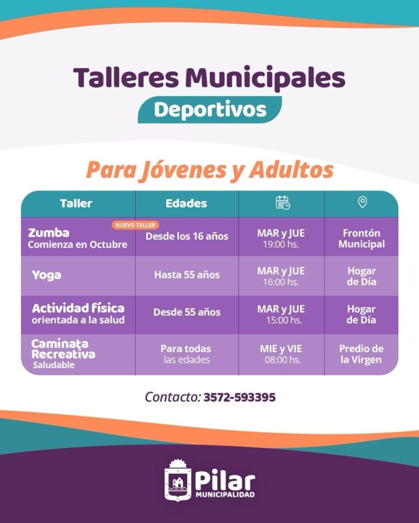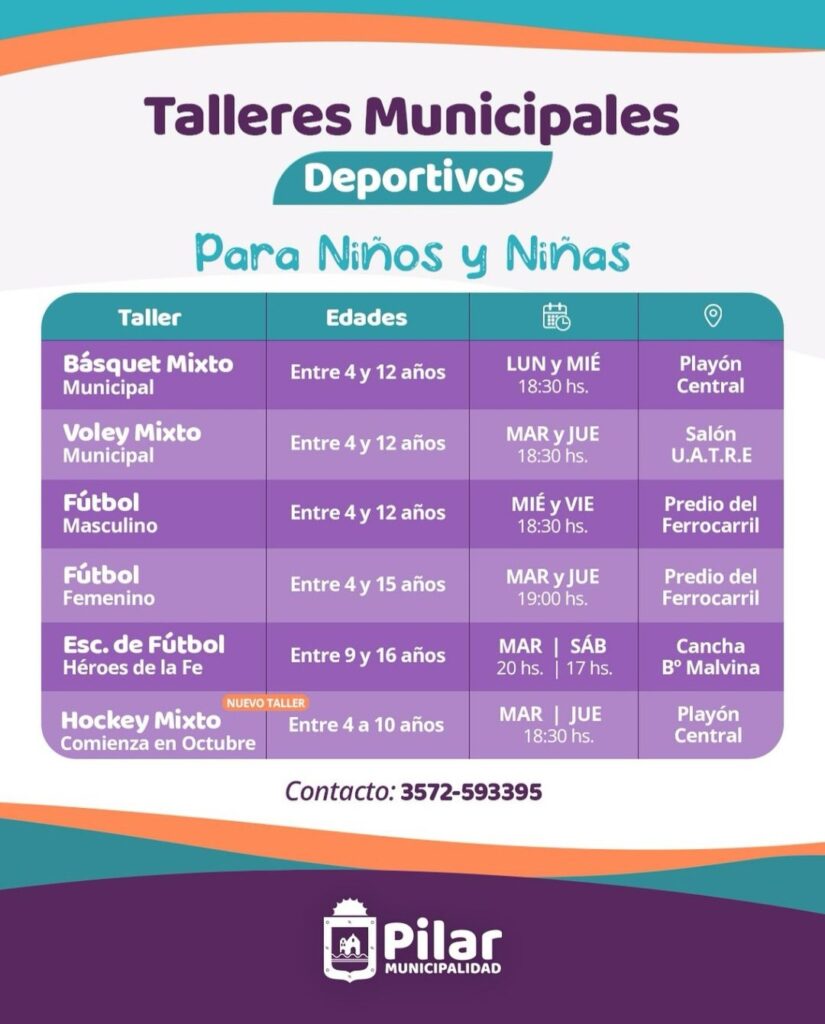 La Municipalidad de Pilar te invita a participar de sus talleres deportivos gratuitos, te dejamos en las siguientes placas los destinados a niñas, niños, jovenes y adultos. En octubre se suma Hockey para niños y Zumba