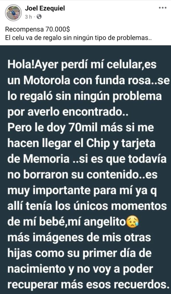 El dispositivo extraviado es un Motorola con funda rosa, y su mayor interés radica en recuperar los archivos almacenados, ya que allí conserva imágenes únicas de su bebé y de sus otras hijas en momentos especiales, como su primer día de nacimiento.